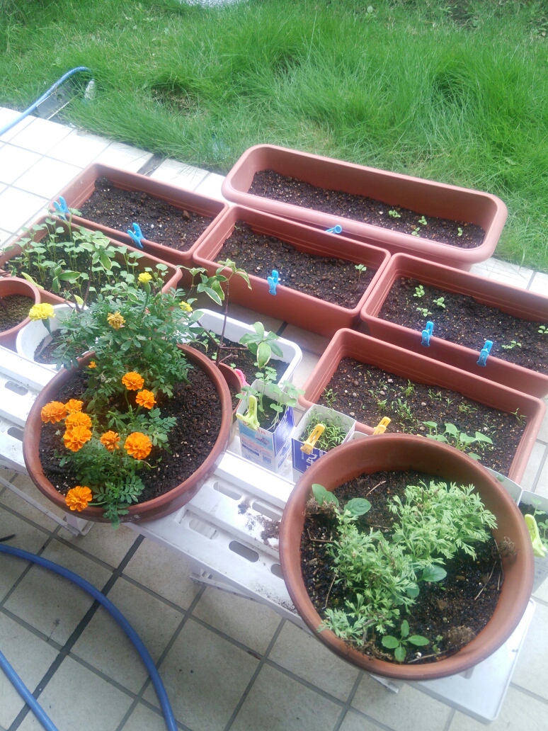 我が家の庭は家庭菜園が多くなり、あまり華やかとは言えません。春先は沈丁花、5月前後はチューリップが咲きますが、夏~秋にも花が咲いていたらいいなぁと感じています。 今現在の我が家のプランター&牛乳パックたち。 唯一鮮やかなオレンジ色の花があります。 先日買ってきましたマリーゴールドです。 今はこのマリーゴールドだけが庭に彩りを与えてくれています。このオレンジ色、私の好きな色なのです。 秋まで花を咲かせるそうなので、しばらくは庭のシンボル的な存在になりそうです。買い足したいとも考えていますが、別の花も検討しようかな。 PR 【スポンサーリンク】