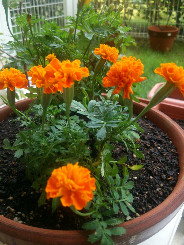 我が家の庭は家庭菜園が多くなり、あまり華やかとは言えません。春先は沈丁花、5月前後はチューリップが咲きますが、夏~秋にも花が咲いていたらいいなぁと感じています。 今現在の我が家のプランター&牛乳パックたち。 唯一鮮やかなオレンジ色の花があります。 先日買ってきましたマリーゴールドです。 今はこのマリーゴールドだけが庭に彩りを与えてくれています。このオレンジ色、私の好きな色なのです。 秋まで花を咲かせるそうなので、しばらくは庭のシンボル的な存在になりそうです。買い足したいとも考えていますが、別の花も検討しようかな。 【スポンサーリンク】