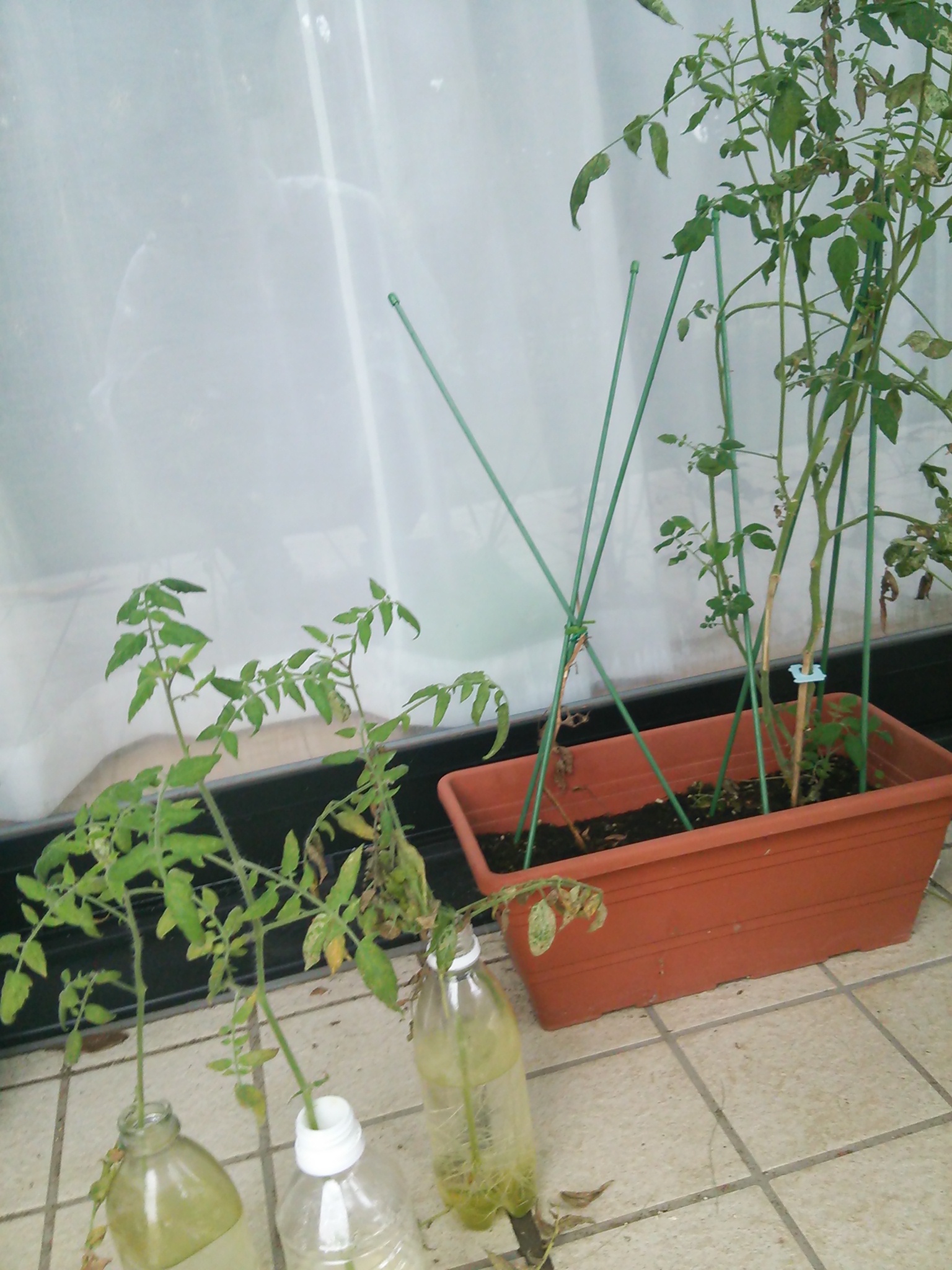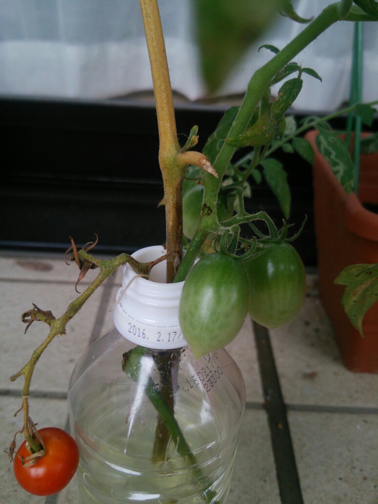 水差しのミニトマト、もう限界のものも出てきました。 一本は変色して、実もこれ以上は変化がありません。枝自体の栄養を使いきった、という感じでしょうか。 もう一本は根っこを伸ばして、何とか栄養を取り込もうとしているのか。この状態で栄養のある土に植えたら、またにょきにょきわき目が生えてくるのでしょうか。 この後、子供たちがミニトマトを次から次へと採っては食べるので、ほとんど実は無くなってしまいました。 何とか再生させたい・・・。 【スポンサーリンク】