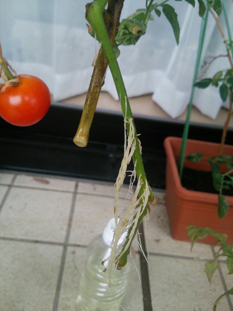 水差しのミニトマト、もう限界のものも出てきました。 一本は変色して、実もこれ以上は変化がありません。枝自体の栄養を使いきった、という感じでしょうか。 もう一本は根っこを伸ばして、何とか栄養を取り込もうとしているのか。この状態で栄養のある土に植えたら、またにょきにょきわき目が生えてくるのでしょうか。 この後、子供たちがミニトマトを次から次へと採っては食べるので、ほとんど実は無くなってしまいました。 何とか再生させたい・・・。 【スポンサーリンク】