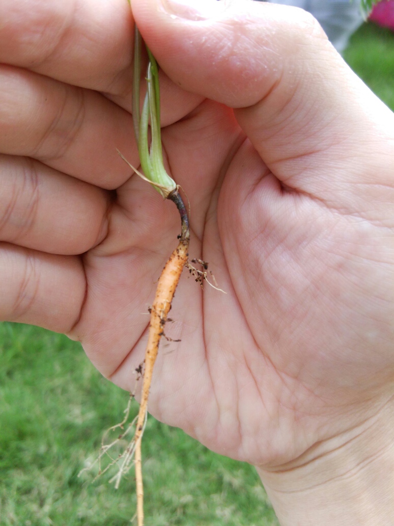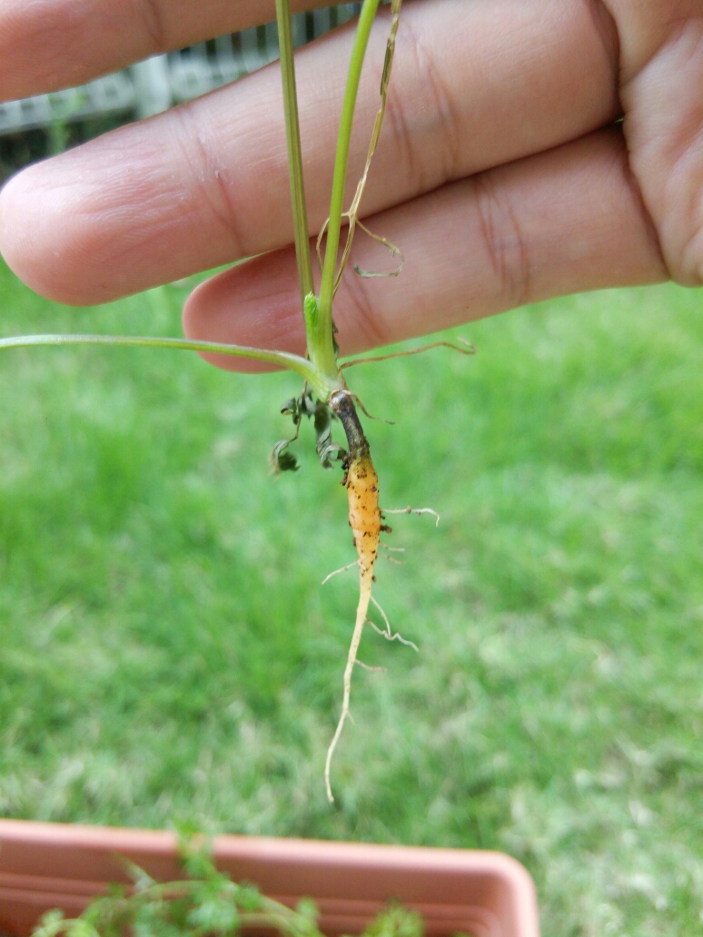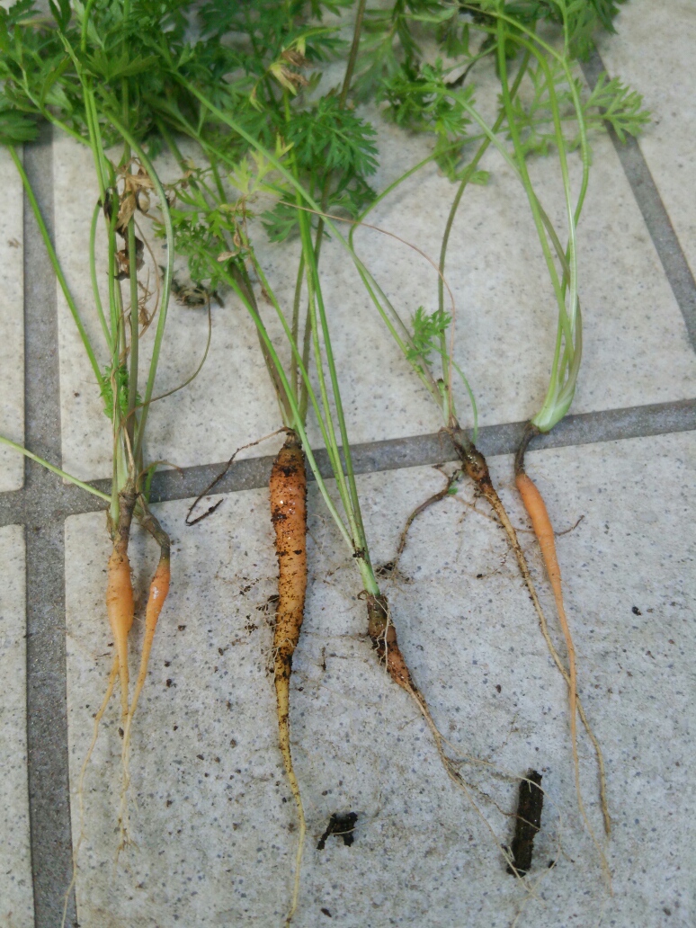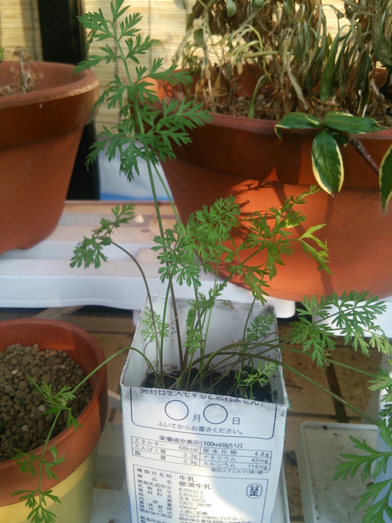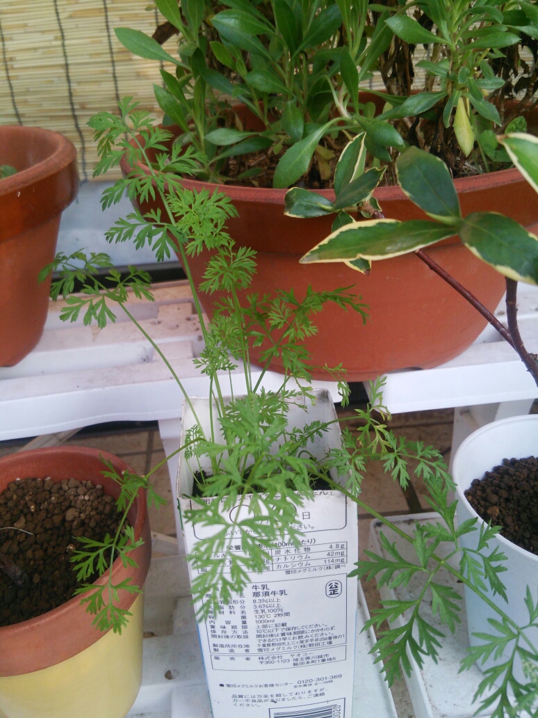 プランターと牛乳パック、どちらも順調のとは言えず。途中で葉っぱが伸びなくなったり、水のやり過ぎがあったりでほとんど育ってないんじゃないかと思いましたが、さてどうなることか。 まずはプランターの人参。 もう葉っぱが倒れていますが・・・ 娘に根本から引っ張ってもらうと おお!! 極小ではありますが、ちゃんと人参になってる!!! ほかのプランターからも3本ほど取れました。 そして、牛乳パック。 こちらは土がぎゅうぎゅうで固くなっめいるのか引っこ抜くのが難しい。これでは根っこも期待できないなぁ、と思いつつ、土ごと出してみると おぉぉっ!ちゃんと出来てる! つまようじくらいの長さではありますが、ちゃんとオレンジ色になった人参が。 ん~素晴らしい。 収穫結果。 何とか人参らしくなったのが6本できました。水洗いし、てちょっと葉っぱをかじってみたところ、「うん、人参!!」濃厚な人参の風味が。 娘は生で1本食べました。「うん、人参!!」とのこと。 残りは茹でて、何も付けずに食べました。 家で作った野菜って野菜そのものの味がしっかりしている気がします。トマトしかり人参しかり。 その分、苦手な人はより食べにくいでしょうが、子供たちはおやつのように楽しそうに食べていました。自分で採った、というのが嬉しいのでしょうかね。 ということで人参、大きくはならなかったし数もそれほど取れなかったけど、楽しく食べられたので大成功! 種も残っているし、また作ろうっと。 【スポンサーリンク】