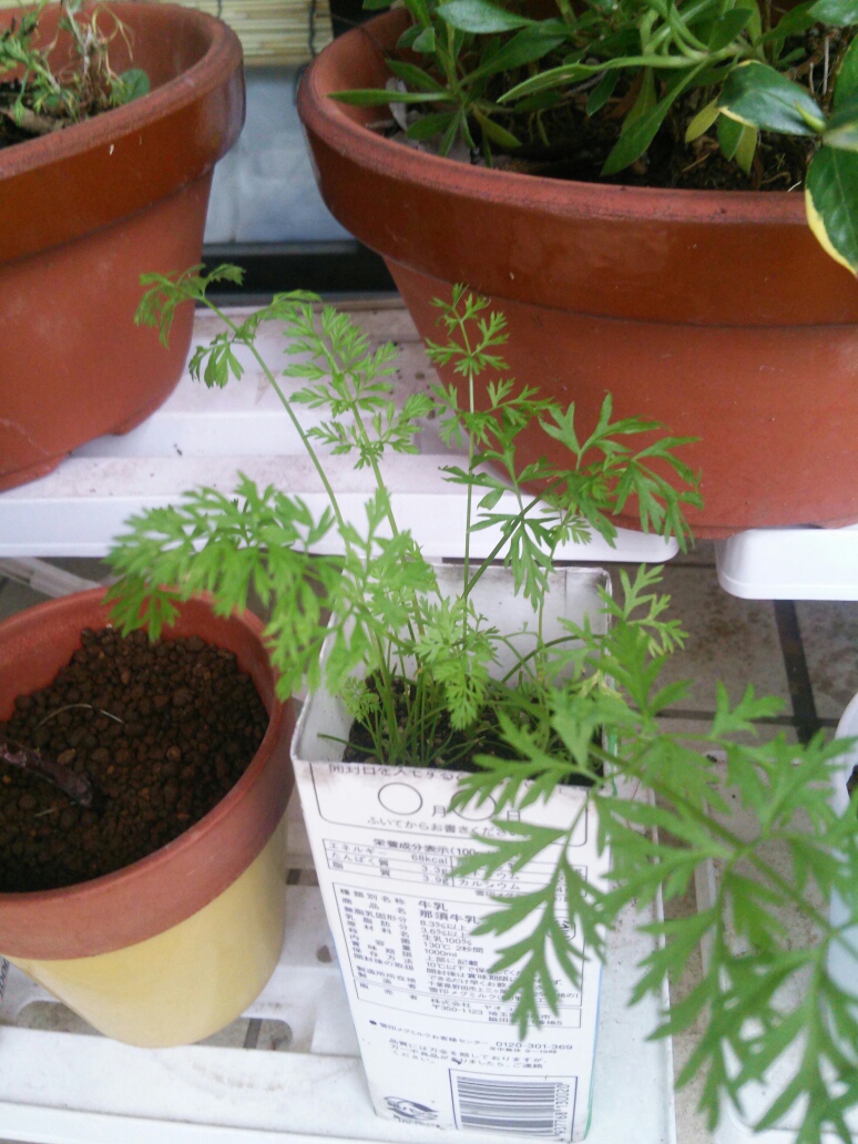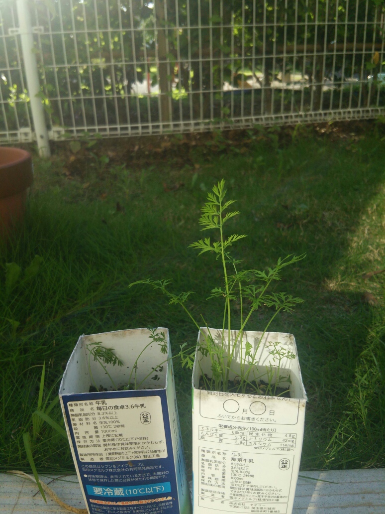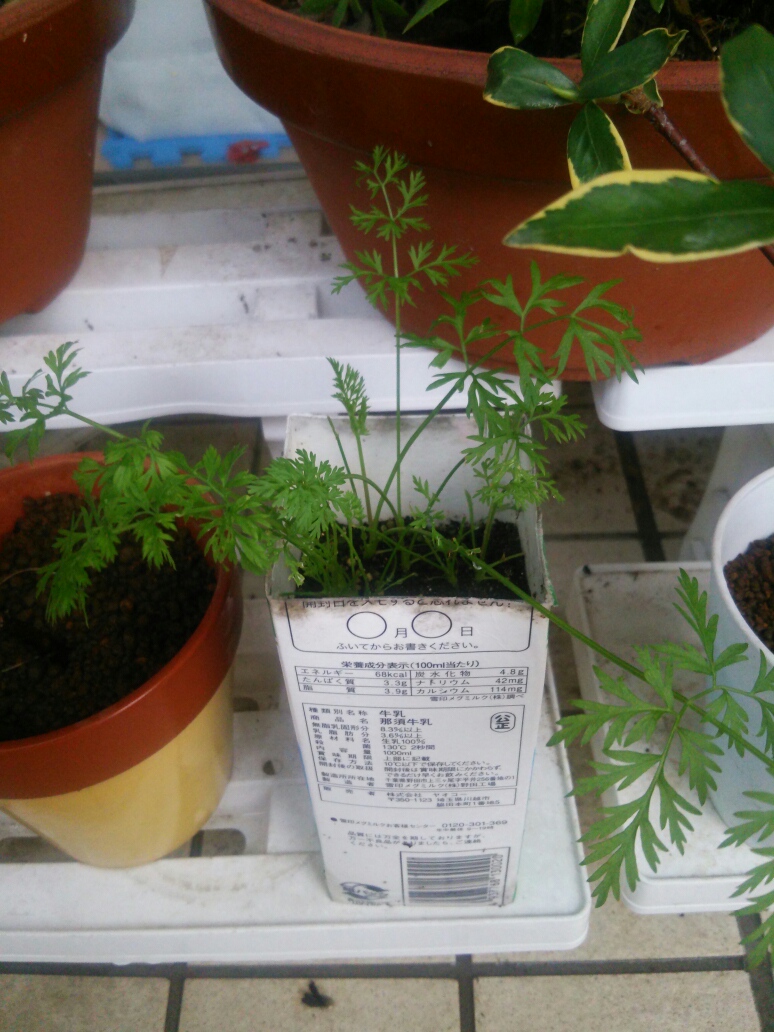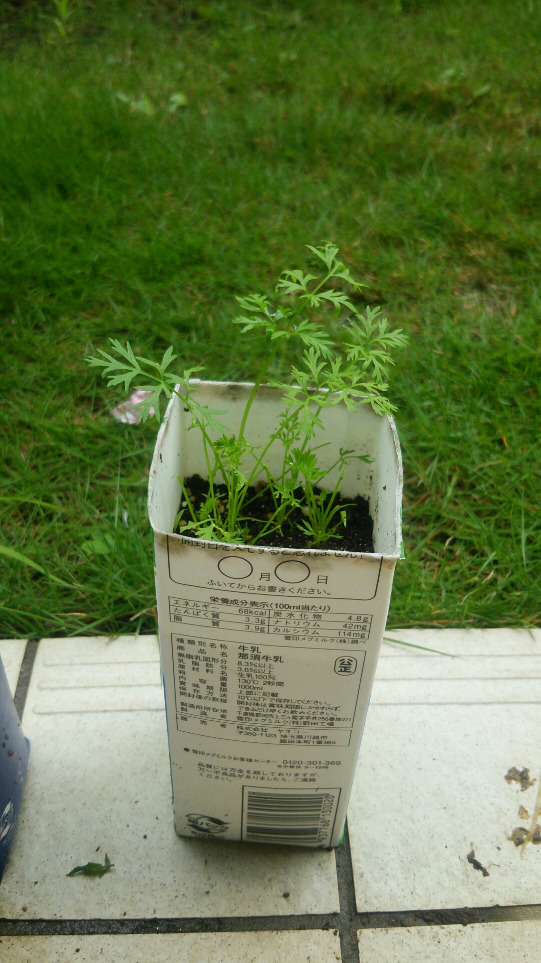 テレビでやっていた牛乳パックでの人参栽培、影響をモロに受けて初めてみました。