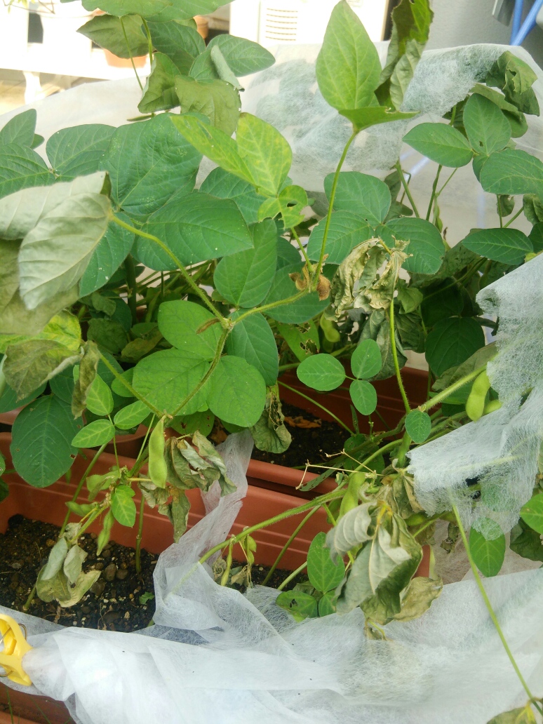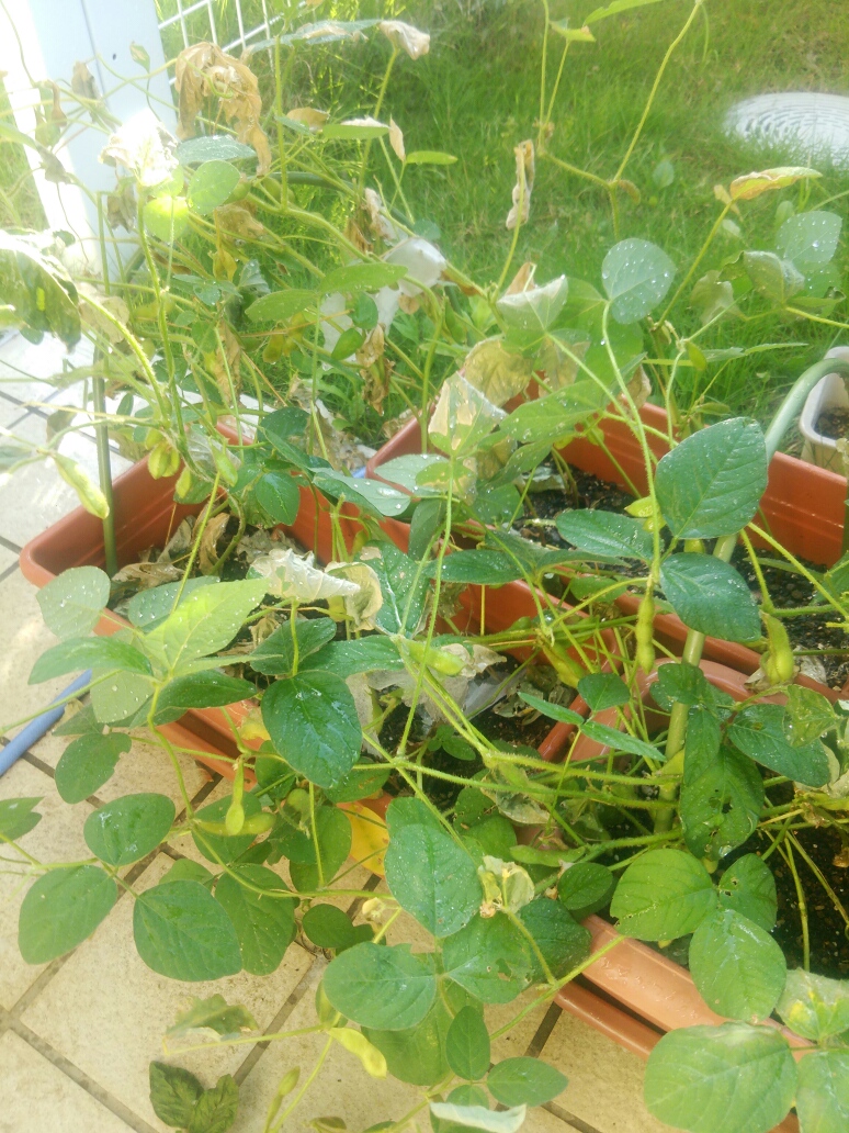 一日家を空けてしまいまして、枝豆がこんなことになってしまいました。 ところどころ枯れてる。。。 前は一日水やりをしなくても大丈夫だったので、ネットが破れたことも関係あるかな。直射日光浴びすぎたか? あーあ、っていう状態。 枝豆の実はぷっくりしてきたものも。 今付いてる実は大丈夫かな。 このあとたっぷり水やりしました。復活してくれるかな。 今の時期に一日手入れを飛ばしてしまうと大変なことになりますね。 次に何を育てるかを考えるのもいいですが、今いる植物たちも大事にしていきたいと思います。 【スポンサーリンク】